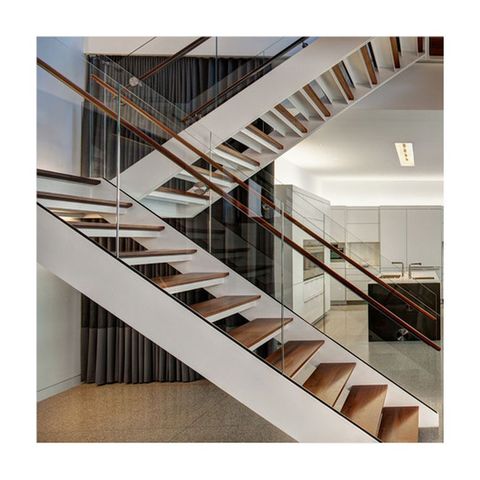 Escalera de madera moderna en forma de U de doble tirante con balaustrada de vidrio