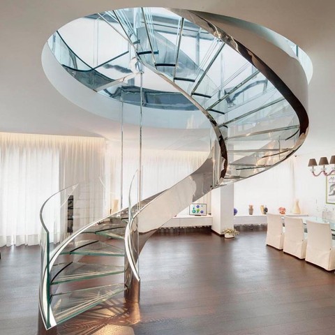Escalera helicoidal curva con barandilla de vidrio sin marco, barandilla de acero inoxidable
