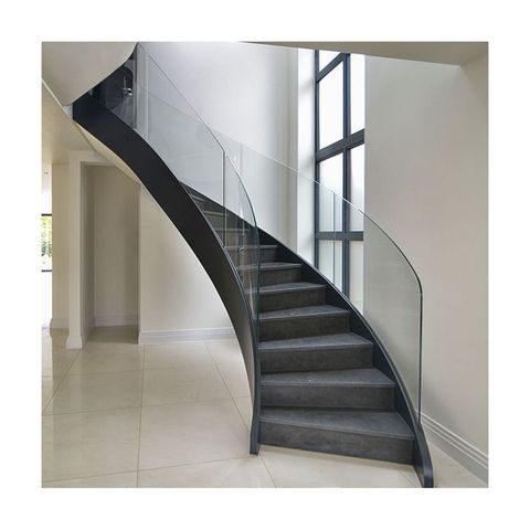 Barandilla de vidrio decorativa escaleras curvas de metal para interiores/escalera de arco con banda de rodadura de madera