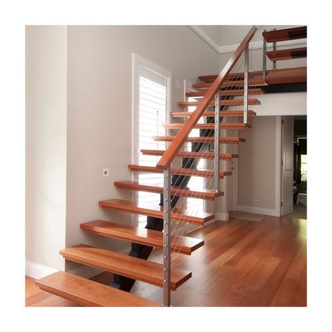 Escalera de viga simple de diseño moderno con peldaños de madera maciza y barandilla de Cable